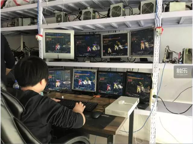 里屋是工作间,靠墙摆放着巨大的白色铁架,散装的风扇在上面大声呼啸。8台15英寸显示器排成两行,这些显示器分属5个不同的牌子。所有显示器上都是相似的画面,这些画面由同一个键盘操作着。而正在敲击键盘的是一个女人。在她眼里,这显然是工作,而非游戏。