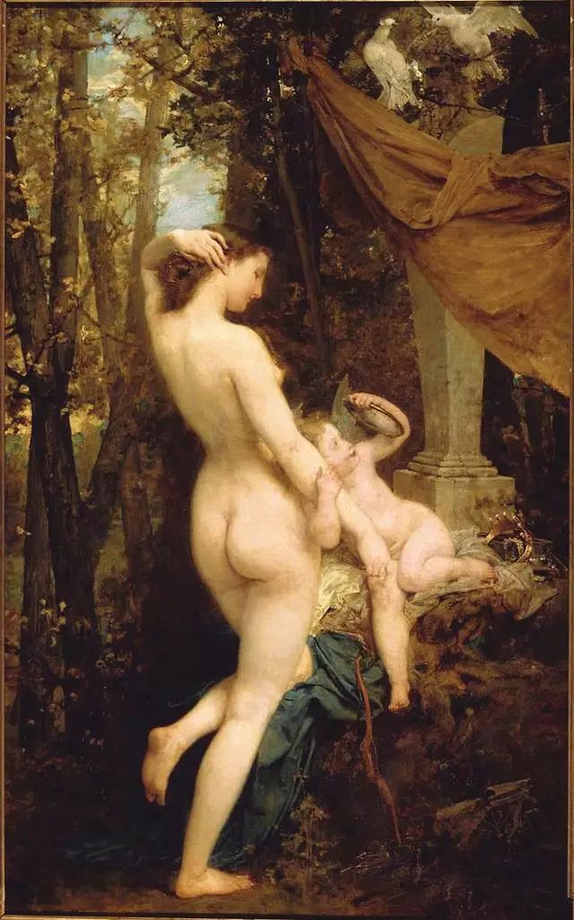 布歇是洛可可艺术特征最突出的体现者,他也被称为“向妇人献殷勤的洛可可画家”。这幅画是庞毕度夫人为最喜爱居住的贝尔维尔宫的梳妆房内装饰,委托布歇所绘制。画中的丘比特和鸽子是维纳斯作为爱神的象征,花朵暗示维纳斯是花园的守护人,而珍珠是在叙述维纳斯从海中诞生的神祕故事。