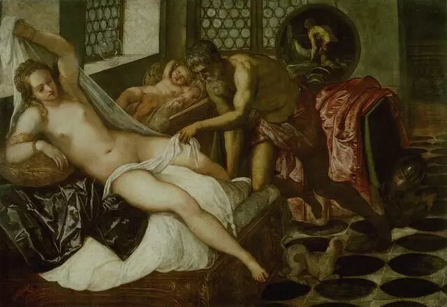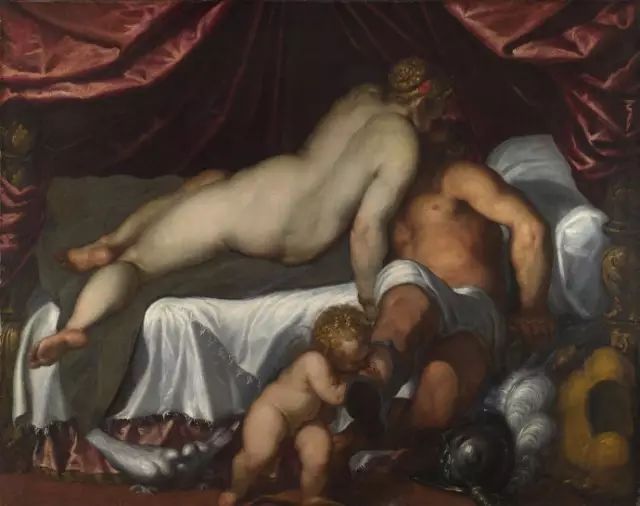 丁托列托的这件作品,描绘了捉奸现场的丈夫、妻子、男小三的瞬间,古典绘画的“娱乐性”可见一斑:豪华卧室里,丘比特已经熟睡,维纳斯倾斜着身体,武尔坎努斯掀起妻子下半身轻薄的内衣,想要搜索出轨的证据,可妻子一幅无所谓的态度,就这么岔开大腿随丈夫检查。画中还有一个不易被发现的点:柜子下面藏着一个全副武装的男小三——战神马尔斯。