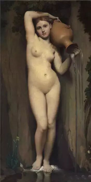 脱胎于《阿纳底奥门的维纳斯》的《泉》,场景更加单纯,人物体态更加自然,画面更加典雅抒情。《泉》是如此完美地描绘了女性的美,以致于这部作品完成后:“同时出现了五个买主,有人简直向我猛扑过来。他们争执不休,我几乎要让他们抓阄来决定。”