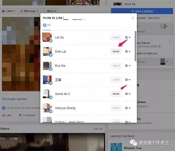 具体招式:在你的过往发帖中,点击那些与你有过互动的人名——不论是“点赞”(liked)、还是“喜欢”(loved),然后会出现三个按钮:邀请(invite –可点击)、已点赞(liked –不可点击)和已邀请(invited — 不可点击)。点击“邀请”键即可。一般而言,15-20%的被邀人会成为你的粉丝。