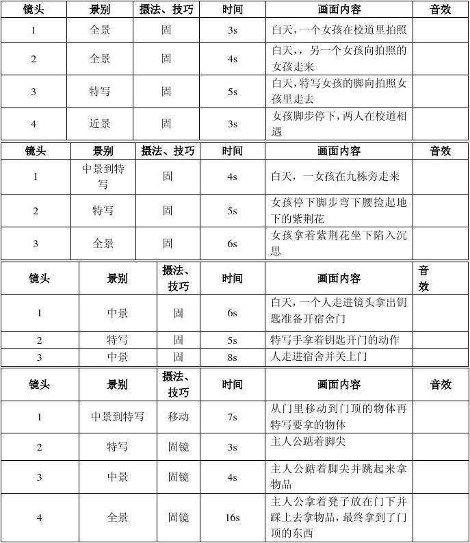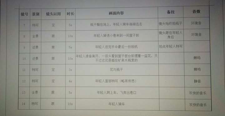 先说说本人吧,在拍片前是极少会去做分镜头脚本的(也就是视频脚本),为啥呢,我拍的片子很多都是自己拍自己剪,所以自己知道最终的成片是什么样的(每个画面的景别,构图,画面内容,镜头运动等等),在现场拍摄的时候只要按着自己心中所想一个一个把镜头拍好,后期剪辑的时候按顺序把镜头拼接好就可以了。用一个词来形容的话就是心中有数。