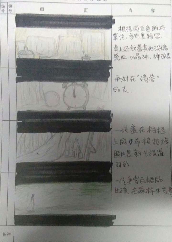分镜脚本:对于拍成视频的作品而言已经是工作惯例,部分拿着文学剧本就开拍的导演(王家卫)是特例。对于动画拍摄,脚本必须是分镜草图,也就是故事板,电影工业不断成熟的今天电影也有不少按照动画的方式画分镜草图的。分镜脚本的格式并非一成不变,业内通常使用表格形式、草图形式,对于拍一般的视频来说,表格形式完全足够。